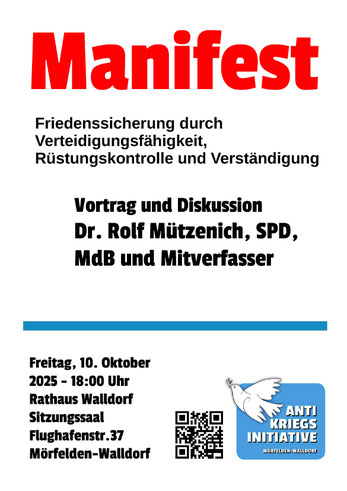 Mit dieser Veranstaltung setzt die Antikriegsinitiative ihre Veranstaltungsreihe fort. Wir möchten allen Interessierten Gelegenheit geben, über das Manifest der SPD-Friedenskreise ins Gespräch zu kommen und über die Aspekte einer zukunftsfähigen Friedens- und Sicherheitspolitik zu sprechen.