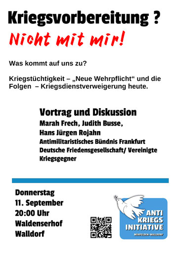 Und wie steht es um die grundgesetzliche Alternative nach § 4 Abs. 3, das Recht, den Kriegsdienst zu verweigern? Solche Überlegungen waren es, die die Antikriegsinitiative Mörfelden-Walldorf bewogen haben, eine Veranstaltung zu diesem Thema und zu den formulierten Fragen anzubieten.